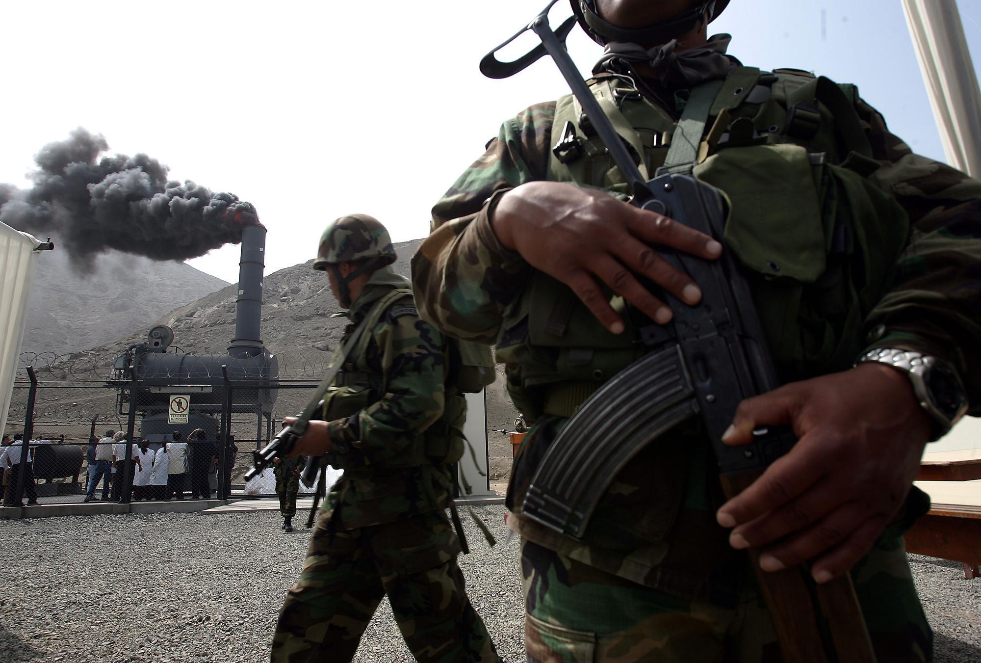 2007年11月8日,安全人员在秘鲁首都利马东郊一处销毁毒品的现场警戒。新华社发警察扮成动漫人物抓毒贩听起来有趣,却是当地警方在毒品犯罪猖獗背景下的无奈之举。秘鲁大量种植可用于提取可卡因的古柯。依照英国《每日邮报》说法,对当地人而言,咀嚼古柯叶是补充能量或缓解高原反应的一种传统方法,这样使用古柯叶并不违法。